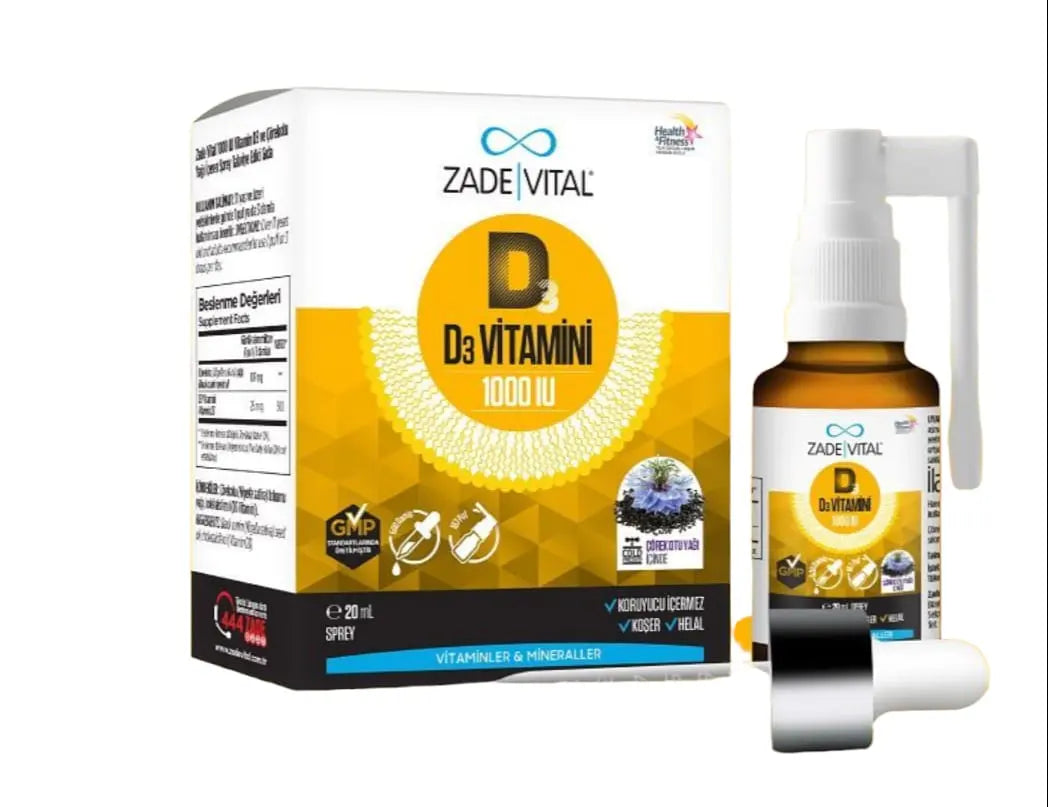 Zade Vital Vitamin D3 Oral Damla/Sprey, 3 damla/1 spreyde 25mcg Vitamin D3 ve 107mg çörek otu yağı içeren bir gıda takviyesidir.
