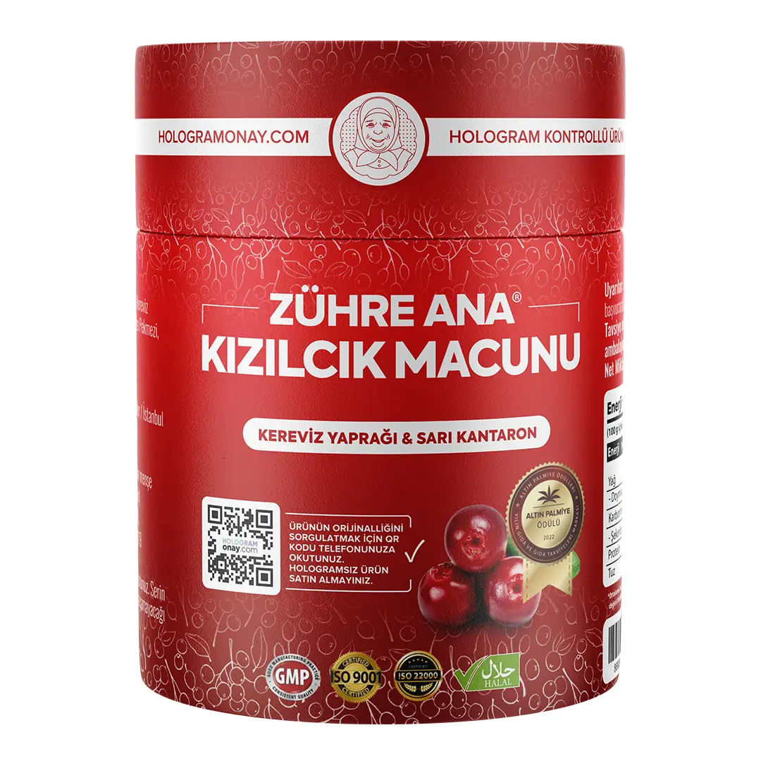Kızılcık Macunu Zengin içerik yapısıyla dikkat çeken ürün; %40 kızılcık, kereviz yaprağı, sarı kantaron ve çörekotu ile harmanlanmıştır. Doğal tat profili, keçiboynuzu pekmezi ve çiçek balı ile lezzetlendirilmiştir. Geleneksel yöntemlerle katkısız olarak hazırlanmış olup, yüksek kalite standartlarında doğal içerikler kullanılarak üretilmiştir.