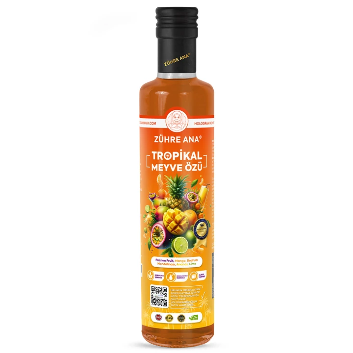 Zühre Ana Tropikal Meyve Özü, tropikal meyvelerin en taze ve lezzetli halini sofralarınıza getiriyor. Çarkıfelek (passion fruit), mango, mandalina (Bodrum), ananas ve misket limonu (lime) gibi doğal meyvelerle hazırlanmış bu öz, yüksek vitamin içeriğiyle ferahlatıcı ve lezzetli bir tat sunar. Yüksek kalite standartlarında üretilen Zühre Ana Tropikal Meyve Özü, doğal ve katkısız içeriğiyle gün boyu keyifli bir içecek alternatifi yaratır. Hem tek başına hem de içeceklerde, tatlılarda ya da yoğurtlarla mükemmel bir uyum sağlar.